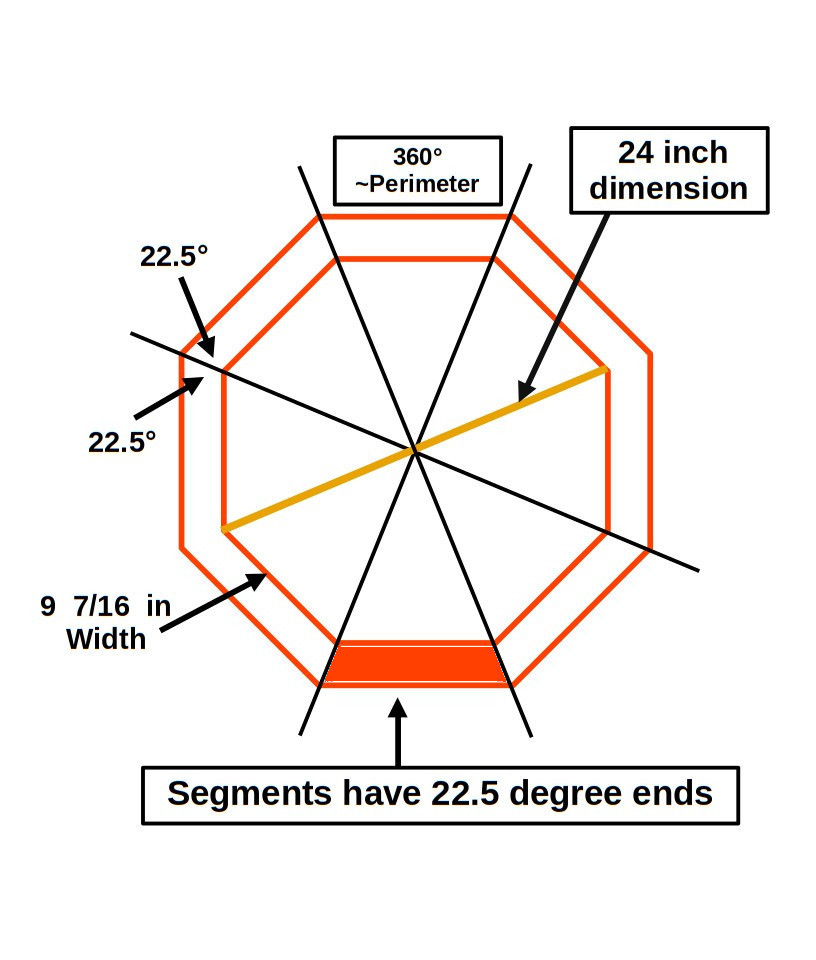 NOTE: I know the formula for an octagon perimeter is P = 8a (where the segments is labeled a. However, if the segment length is unknown or difficult to find. Using a circle perimeter formula ( π D) or 2πr will give a surprisingly close answer to segment length. This is not an idle calculation. The image above is an actual octagon I built and used as a concrete form to make pads to put my trash cans on. As one can see the joints are very accurate. only the tie down ratchet holds the boards together. There are (45 * 8) = 360 exterior degrees and (135 * 8) = 1080 interior degrees in an octagon.